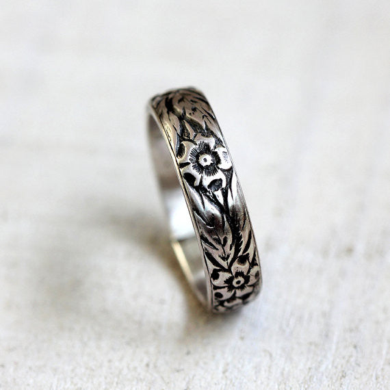 Sterling silver or gold floral pattern ring. This flower pattern ring makes a wonderful woman's wedding ring or a great everyday ring.