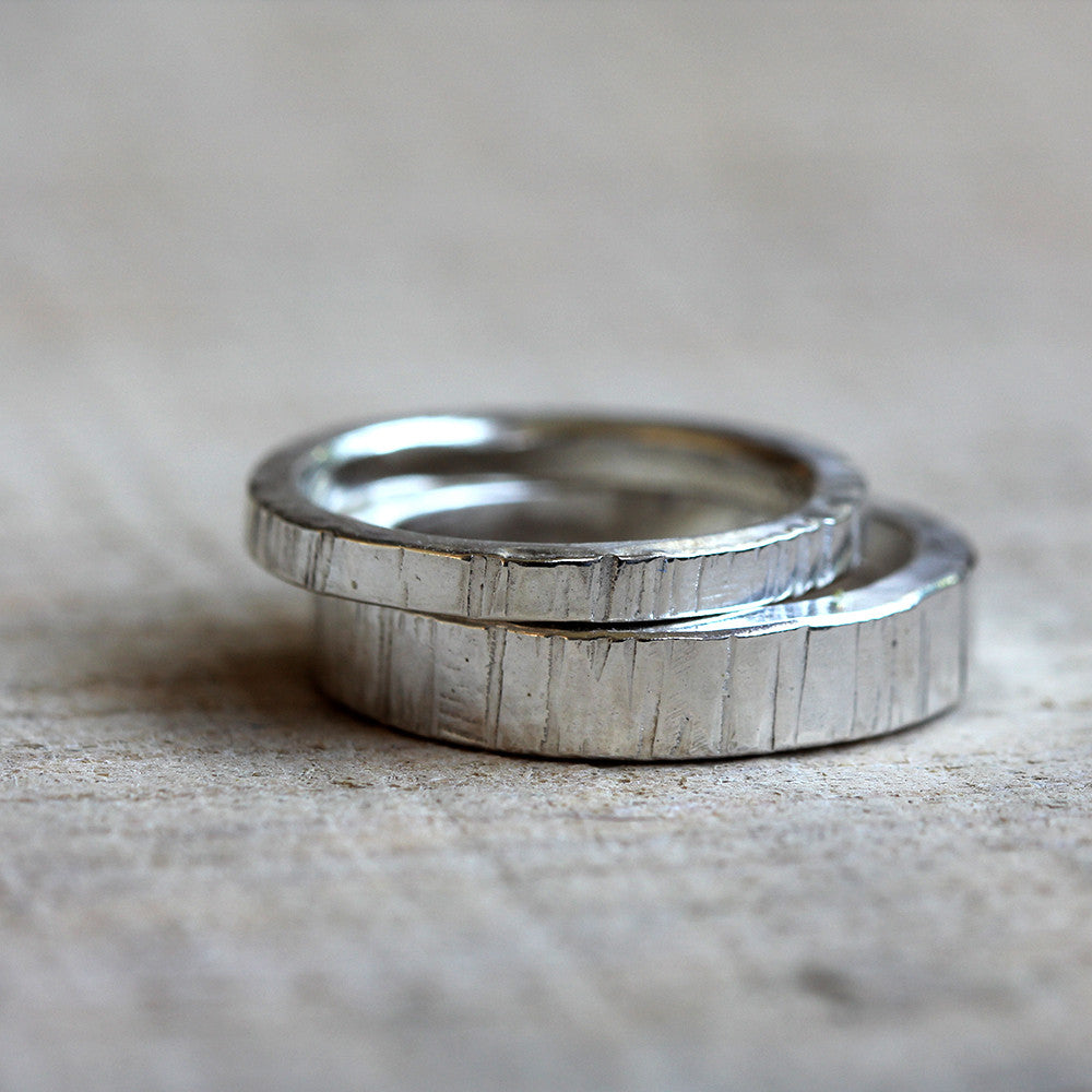 Sterling silver tree bark wedding ring set. I have applied by hand the wood grain pattern that adorns these wedding rings. Organic and completely random pattern makes each ring unique and one of a kind. The wider ring measures about 4mm wide and 2mm thick and the narrow ring measures about 2 mm wide and 2mm thick.